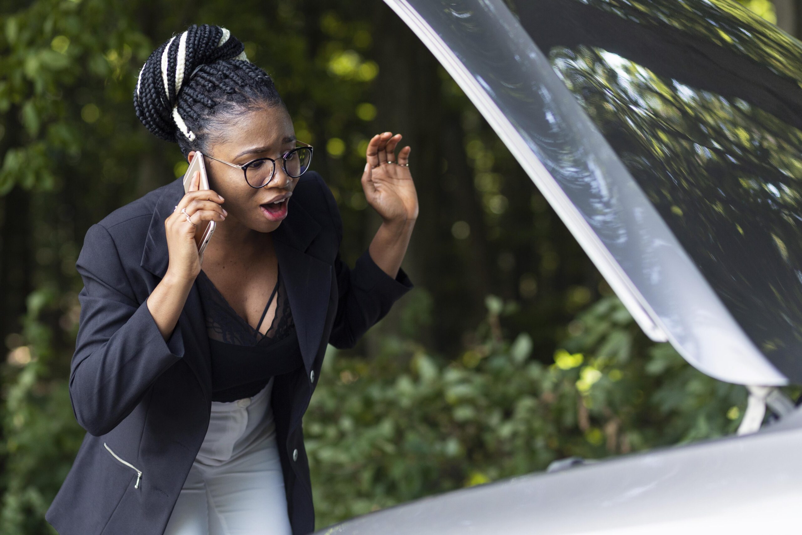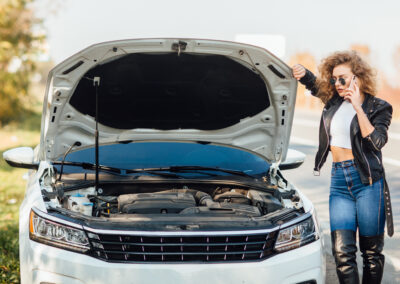 young-woman-standing-near-broken-car-with-popped-hood-talking-her-mobile-phone-while-waiting-help